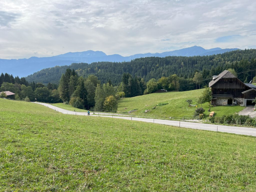 Morgens war es heiter bis wolkig und wir starteten zu einer neuen Radtour. Erst fuhren wir auf der Nordseite nach Döbriach und anschließend bogen wir nach Süden über den Berg ab. Es ging ganz schön steil bergauf. Auf der Höhe angekommen, bogen wir Richtung Osten ab. Noch ein kleines Stück bergauf und dann bergab durch eine Bilderbuchlandschaft