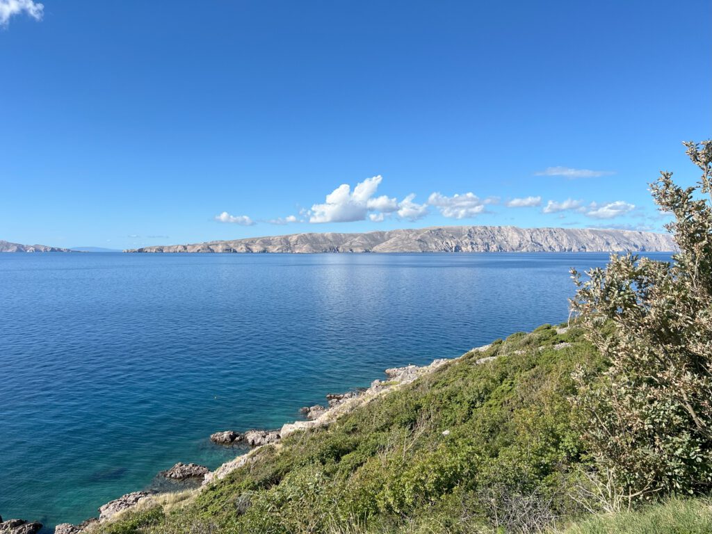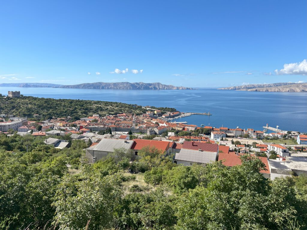 Es schien die Sonne und es wurde bald warm. Nach dem Frühstück machten wir die Fahrräder fertig und eine neue Tor ging los. Komoot bot einen passenden Vorschlag an, den wir annahmen. Zuerst ging es bis Senj und dort bogen wir in eine kleine und sehr steile Gasse ab, die dann zum Schluß in eine steile und kurze Schotterpiste überging. Am Ende kamen wir auf eine gut ausgebaute Straße und nun ging es über 15 km nur bergauf, aber mit schönen Ausblicken auf Senj und die Insel Krk.