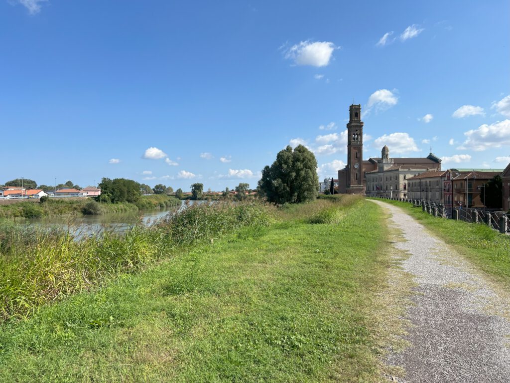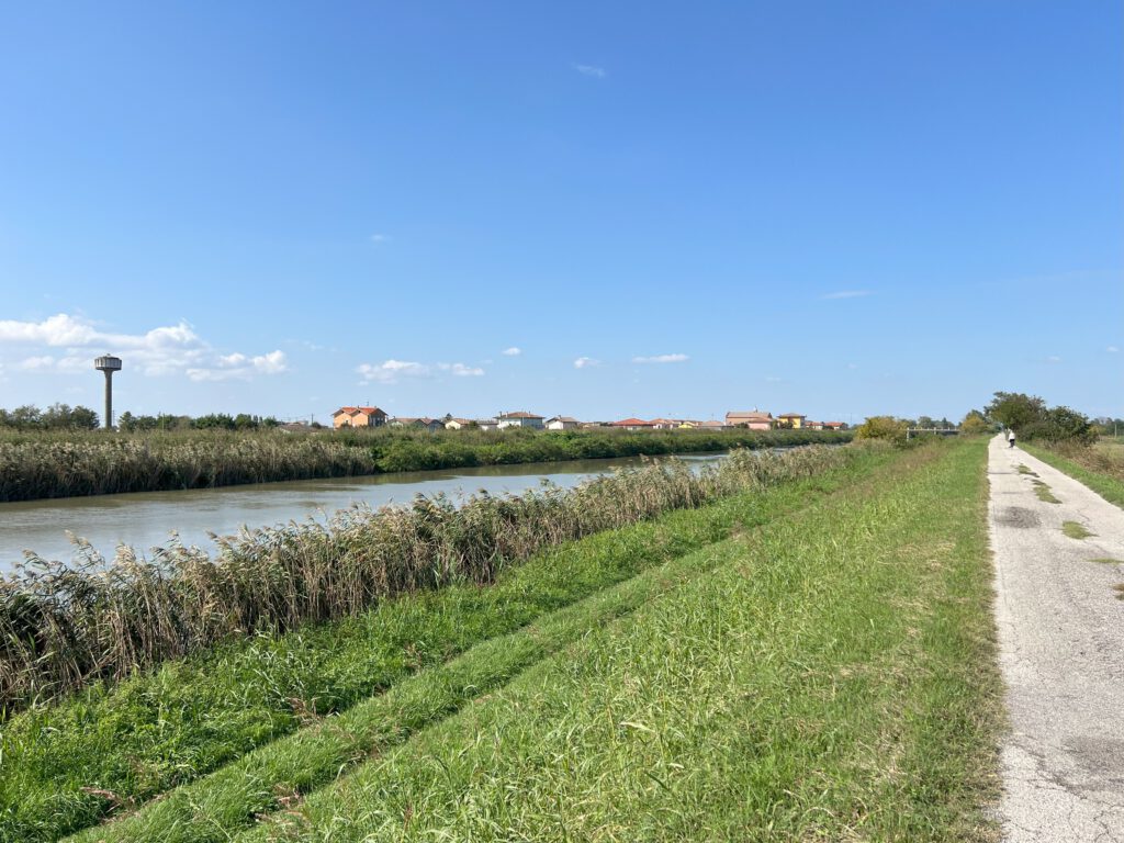 Wir radelten viele Kilometer an Wasserläufen entlang, meist fast ohne Verkehr. Dei höchsten Erhebungen sind die Kirchen der Dörfer und schon von weitem zu sehen. Zuletzt kamen wir in Cavazere an die Adige (Etsch), die hier in die Adria mündet.